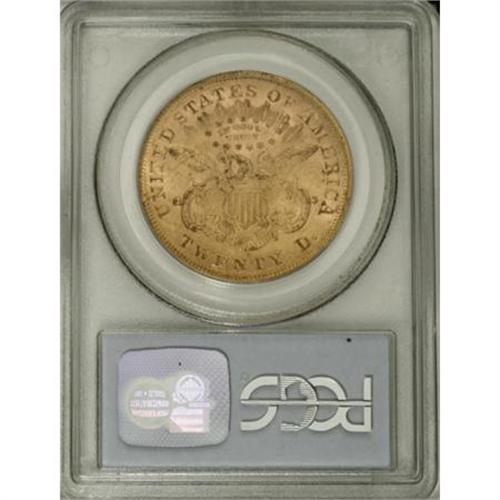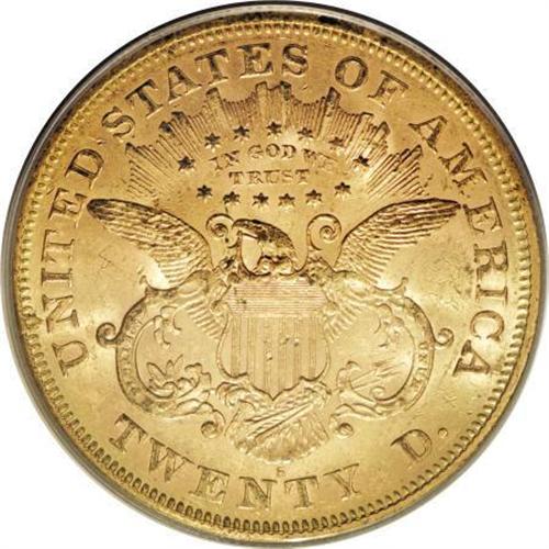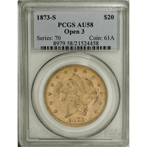 <B>1873-S $20 Open 3 AU58 PCGS.</B></I> By far the scarcer of the two date varieties (Open 3 and Closed 3), just the opposite of the Philadelphia twenty from this year, and a difficult coin to locate in higher grades. This moderately abraded example is well defined for the issue and coated in natural reddish patina. Population: 41 in 58, 39 finer (11/07). <BR><BR><B>Coin Engraver:</B> James B. Longacre<BR><BR><b>Shipping:</b> Coins & Currency (<a target="_blank" href="http://www.heritageauctions.com/common/shipping.php">view shipping information</a>)