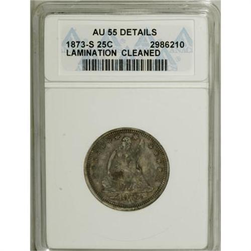<B>1873-S 25C Arrows--Cleaned, Lamination--ANACS. AU55 Details.</B></I> NGC Census: (2/18). PCGS Population (1/14). Mintage: 156,000. Numismedia Wsl. Price for NGC/PCGS coin in AU55: $500. (#5493)<BR><BR><B>Coin Engraver:</B> Christian Gobrecht<BR><BR><b>Shipping:</b> Coins & Currency (<a target="_blank" href="http://www.heritageauctions.com/common/shipping.php">view shipping information</a>\)