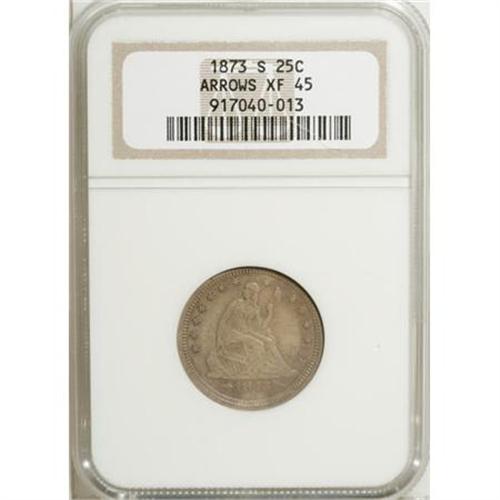 <B>1873-S 25C Arrows XF45 NGC.</B></I> NGC Census: (1/24). PCGS Population (3/19). Mintage: 156,000. Numismedia Wsl. Price for NGC/PCGS coin in XF45: $331. (#5493)<BR><BR><B>Coin Engraver:</B> Christian Gobrecht<BR><BR><b>Shipping:</b> Coins & Currency (<a target="_blank" href="http://www.heritageauctions.com/common/shipping.php">view shipping information</a>\)