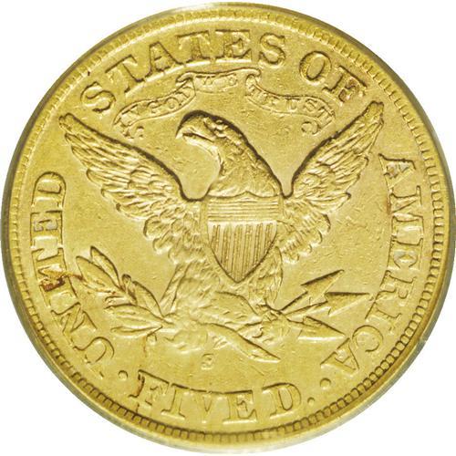 1873-S $5 AU55 PCGS. The 1873-S five dollar, with a 31
