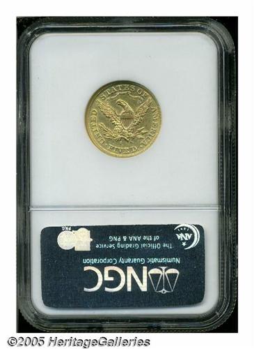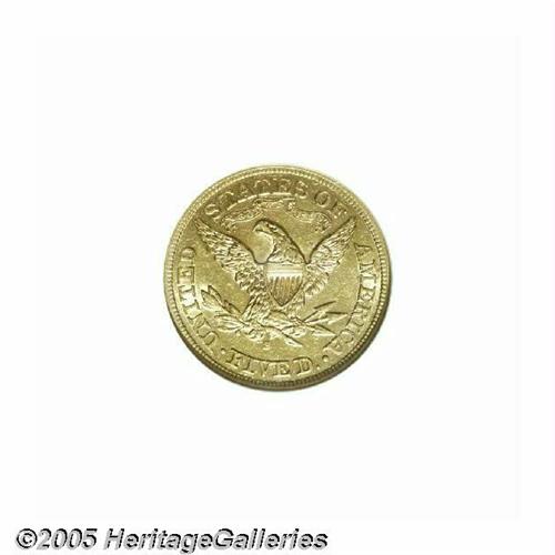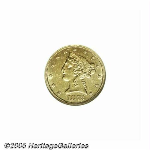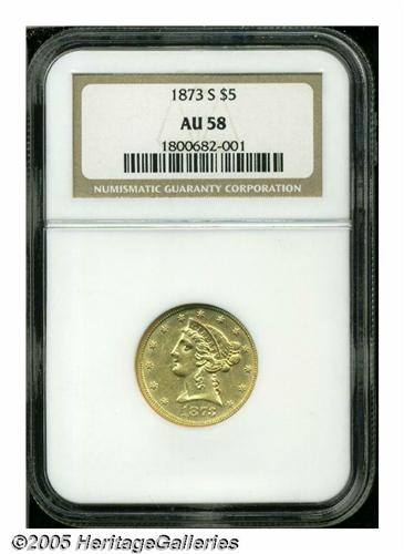 <B>1873-S<$5> AU58 NGC.</B></I> The San Francisco Mint produced just 31,000 half eagles in 1873, all of which display a Closed 3 in the date. The '73-S is extremely rare in any condition, and tend to be seen in Fine and Very Fine grades. NGC has certified 108 coins in all grades, while PCGS has seen 71 pieces (6/05). This high-end AU reveals pleasing yellow-gold surfaces with considerable luster in the recessed areas. The design elements display sharp definition, though portions of Liberty's upper hair and hair bun are soft. A few minute marks are scattered about, none of which are individually serious. Population: 1 in 58, 1 finer (6/05).