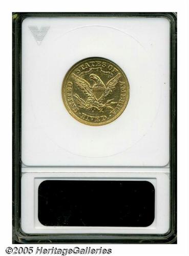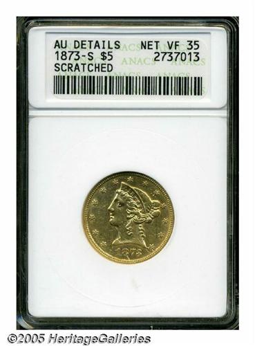 <B>1873-S<$5>--Scratched--ANACS. AU Details, Net VF35.</B></I> A number of lengthy pinscratches traverse the obverse, however, the reverse is unimpaired. Only 31,000 pieces were struck, and a large majority of these coins were eventually melted to reclaim the bullion.