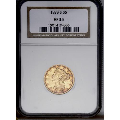 <B>1873-S<$5> VF35 NGC.</B></I> The rims offer surprising glints of deep purplish-amber on this still-lustrous coin. Pleasingly struck, although there are myriad small abrasions, as well as a couple of minor distractions that bear mentioning, namely a couple of light scrapes in the left obverse field, and a small, irregular planchet flaw between stars 12 and 13. <BR><BR><B>Important notice:</B> Heritage usually auctions material at the rate of 200-250 lots per hour. On some occasions eBay Live bid software or the Internet may not be able to keep up with the pace of the auction. We recommend placing a realistic absentee bid now as insurance to avoid disappointment. Occasionally the auctioneer may eliminate or reject an eBay Live bid, and the auctioneer may also reopen a lot after the close of the eBay live bidding (usually because we missed an audience bid), and may reject your bid even if it shows you as the winning bidder. By bidding via eBay Live, you agree that Heritage may award the lot to another bidder at its sole discretion under the circumstances described above or any other reasonable circumstances. Since eBay bids are not shown to us until we open the lot on the floor, we treat those bids just like floor bids. In most cases the floor responds before the eBay bid is presented to us, due to Internet lag time, so for consistency we have made it a policy that floor bids are always considered first over tie eBay live bids. Also please note that all Heritage lots purchased through eBay Live carry a 20% Buyer's Premium. Please make sure you read the Terms and Conditions before you bid. This lot is being auctioned in conjunction with a live floor auction by Heritage Galleries & Auctioneers. All final auction and invoice information will be supplied by Heritage Galleries & Auctioneers, and all other information should be considered preliminary. Lot:2786 <BR><BR><B>Winning Notification and Billing:</B> After the FINAL session in this auction is complete, Heritage will send e-mail and snail mail invoices. This process normally takes several days. All final auction and invoice information will be supplied by Heritage Galleries & Auctioneers, and all other information should be considered preliminary. <BR><BR>This auction will be conducted on a live auction floor and over the Internet through eBay Live. If you choose to place an absentee bid, please take a moment to <font color='#0000ff'><u><a href='http://pages.ebay.com/liveauctions/help/before/laabsentee.html'>learn how eBay Live absentee bidding works</a></u></font><font color='#000000'>