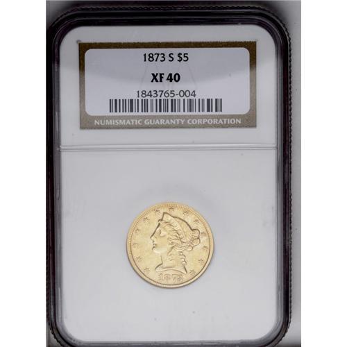 1873-S $5 XF40 NGC. The pleasingly smooth surfaces are 1873-S[$5] XF40 NGC.
