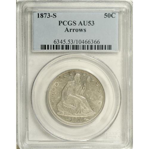 <B>1873-S 50C Arrows AU53 PCGS.</B></I> Lightly worn with some original luster at the periphery. The typically struck devices and fields have light handling marks and pale blue, gold, and violet toning. Population: 4 in 53, 13 finer (12/06).<BR><BR><b>Shipping:</b> Coins & Currency (<a target="_blank" href="http://www.heritageauctions.com/common/shipping.php">view shipping information</a>)