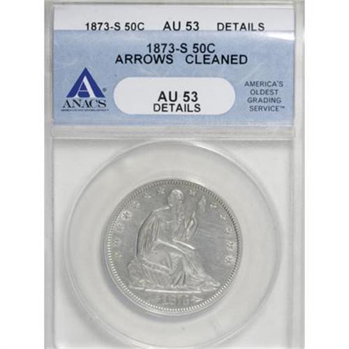 <B>1873-S 50C Arrows--Cleaned--ANACS. AU53 Details.</B></I> A fascinating example of this prized Arrows issue, boldly defined with only a touch of actual wear. The pale silver-gray surfaces show numerous faint hairlines and suspiciously uniform luster.<BR><BR><B>Coin Engraver:</B> Christian Gobrecht<BR><BR><b>Shipping:</b> Coins & Currency (<a target="_blank" href="http://www.heritageauctions.com/common/shipping.php">view shipping information</a>)
