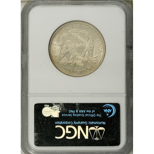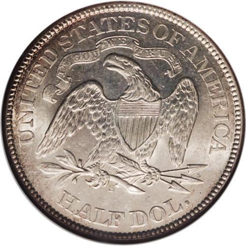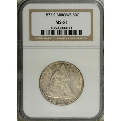 <B>1873-S 50C Arrows MS61 NGC.</B></I> A scarce coin in all grades, this specimen shows light golden and russet patination on both sides, with flecks of slate-gray at the upper obverse periphery. A couple of light scrapes on Liberty's breast and neck are hardly distracting. Significant luster issues forth from beneath the toning, and although the strike is soft on the left side of the scroll, this piece is appealing overall. Census: 1 in 61, 8 finer (12/06).<BR><BR><b>Shipping:</b> Coin/Currency (<a target="_blank" href="http://www.heritageauctions.com/common/shipping.php">view shipping information</a>)