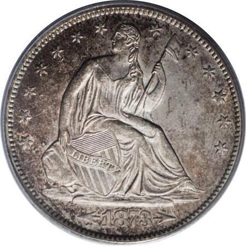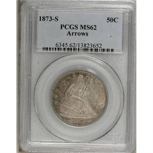 <B>1873-S 50C Arrows MS62 PCGS.</B></I> The 1873-S half dollar with Arrows is a scarce date, especially in high grades, and according to Randy Wiley and Bill Bugert (1993) is "Extremely rare in mint state." PCGS and NGC have, to date, certified about 70 examples ranging in grade from Very Good to Mint State. Soft bluish-gray and rose patina cover the lustrous surfaces of this MS62 specimen, and an attentive strike brings up sharp detail on the design features. Some faint slide marks are visible on the obverse portrait. Population: 1 in 62, 4 finer (6/07).<BR><BR><B>Coin Engraver:</B> Christian Gobrecht<BR><BR><b>Shipping:</b> Coins & Currency (<a target="_blank" href="http://www.heritageauctions.com/common/shipping.php">view shipping information</a>\)