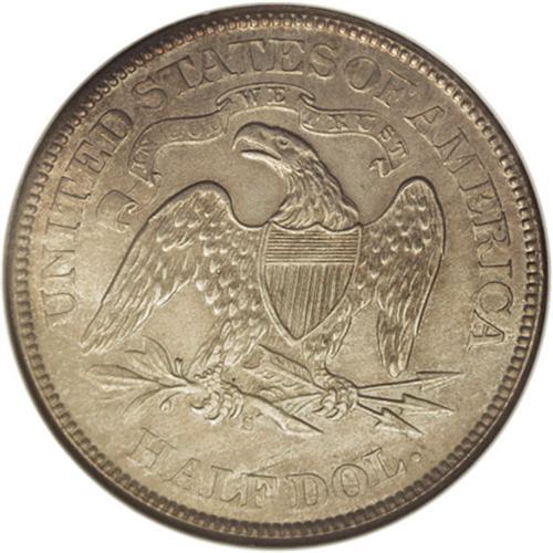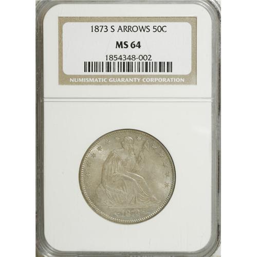<B>1873-S 50C Arrows MS64 NGC.</B></I> Wiley and Bugert call this issue: "Extremely rare in mint state." Population data from NGC and PCGS confirm this assessment, as a mere 13 pieces from the original production of 228,000 coins have been certified in Uncirculated grades by the two major services. This near-Gem offering has a lovely satiny sheen over both sides, illuminating unmarked surfaces and attractive champagne-gray coloration. Most of the design elements are crisply rendered, except for IN GOD and several of the olive leaves on the reverse. Specialists will take note of this significant bidding opportunity, as this example represents the first 1873-S Seated half in MS64 to be sold by Heritage since March 2003. NGC Census: 2 in 64, 3 finer (2/07).<BR><BR><b>Shipping:</b> Coins & Currency (<a target="_blank" href="http://www.heritageauctions.com/common/shipping.php">view shipping information</a>)