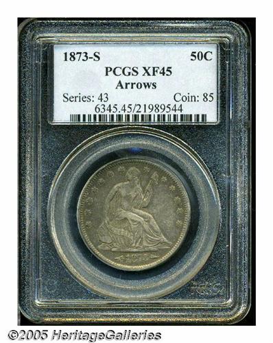 <B>1873-S<50C> Arrows XF45 PCGS.</B></I> The 1873-S Arrows Half Dollar is a scarce coin in any grade. This piece is deeply toned on each side and shows strong striking details and no detracting marks, along with a seemingly minimal degree of wear, for the grade. Population: 5 in 45, 20 finer (5/05).