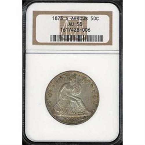 <I>Note: 1873 Half Dollars were released from San Francisco Mint of the arrows style only. "The 'phantom' 1873-S no arrows," according to researcher Bowers, "has been a real mystery coin since Beistle [an early die variety specialist] listed one in his half dollar treatise, but the coin has never turned up. Apparently the San Francisco Mint struck 1873 no arrows half dollars in February 1873 (along with that other phantom coin, the 1873-S seated dollar). On March 5, one of the coins was sent to Philadelphia for assay purposes. The rest were never released before the April 1 changeover to the arrows coinage.<I>