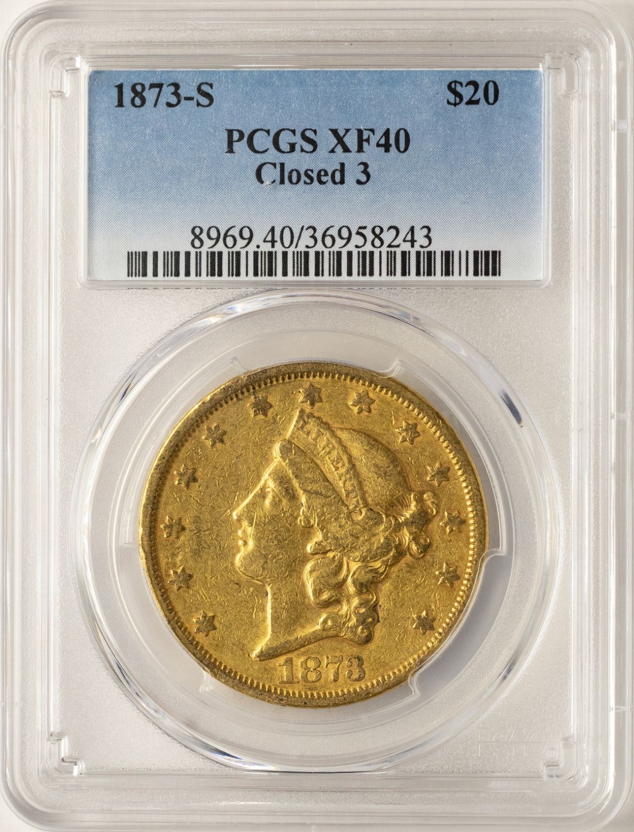 One 1873-S Closed 3 $20 Liberty Head Double Eagle Gold Coin PCGS XF40.