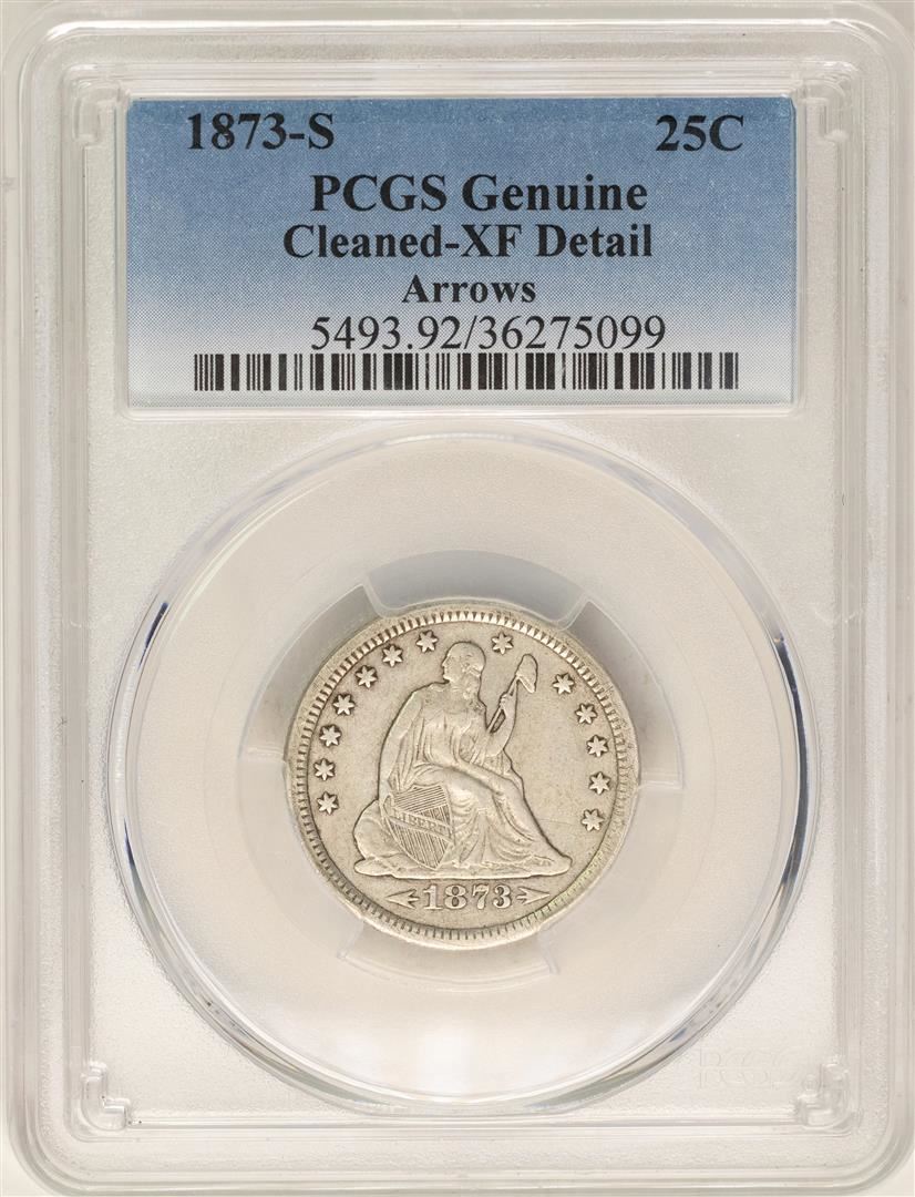 One 1873-S Seated Liberty Quarter Coin PCGS XF Details. PCGS Graded.