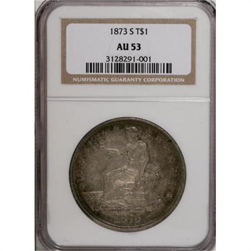 <B>1873-S T$1 AU53 NGC.</B></I> . NGC Census: (2/84). PCGS Population (8/110). Mintage: 703,000. Numismedia Wsl. Price for NGC/PCGS coin in AU53: $425. (#7033)<BR><BR><B>Coin Engraver:</B> William Barber<BR><BR><b>Shipping:</b> Coins & Currency (<a target="_blank" href="http://www.heritageauctions.com/common/shipping.php">view shipping information</a>)