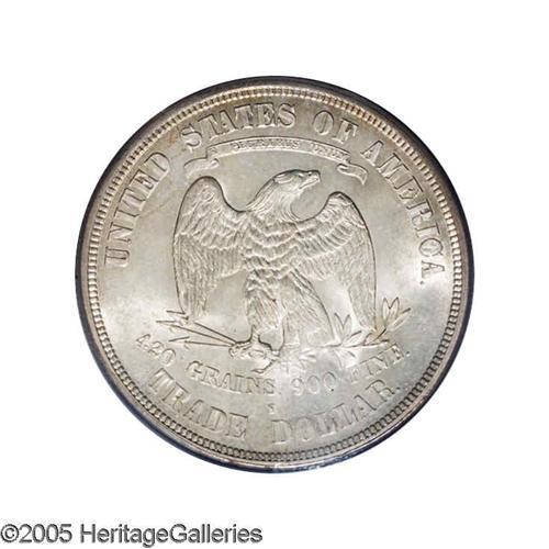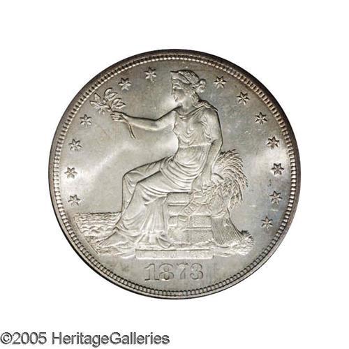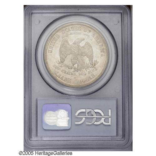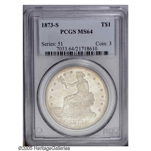 <B>1873-S<T$1> MS64 PCGS.</B></I> A very attractive Choice coin which shows radiant mint luster in the fields and delicate gold toning over the surfaces. The strike is reasonably sharp, although the central devices are not quite fully struck. For this date, this grade is as nice as a collector can hope to find, with NGC and PCGS showing a total of seven coins graded finer between those grading services. An opportunity for the specialist. Population: 19 in 64, 3 finer (12/05).<BR><I>From The Andy Geosits Collection of Trade Dollars.</B></I>
