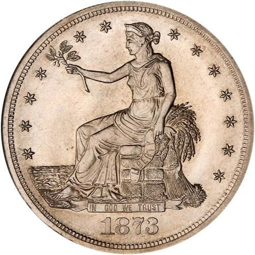 <b>1873-S Trade Dollar. NGC graded MS65.</b> NGC Pop: 3/2. Having been long desirous of offering a high-end example of the first year for Trade Dollar production from San Francisco, it is plain to us that this sharp specimen sets the trend that will be difficult to follow through in the near term. The San Francisco Mint outstripped both Philadelphia and Carson City in terms of production this year. The reason, of course, is San Francisco's export relations with the Orient made it the primary port of exit for these large silver trade coins. Many were indeed exported that year. The 1873-S has a relatively low survival rate in Mint condition. For that reason, it is a prime condition rarity among S-mint Trade Dollars. The Gem threshold coins are usually offered at only the widest intervals in the market, so now is your chance to snare one before it flits away into some long-term collection.