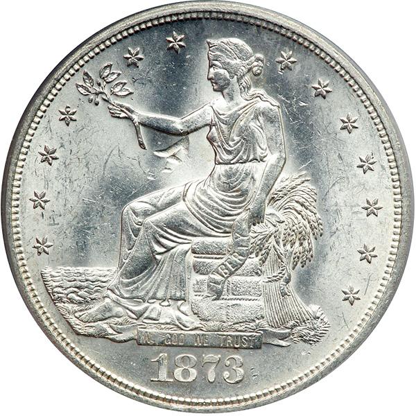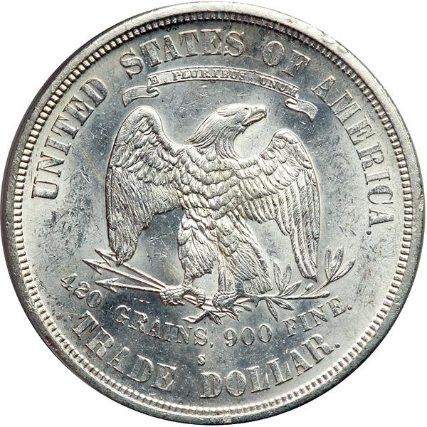 1873-S Trade Dollar. PCGS graded MS-62. Chop Mark. The Chop Mark is on the obverse side. A nice untoned coin. The 1873-S is considerably scarcer in Mint condition than later S-mint dates (PCGS # 7033) .