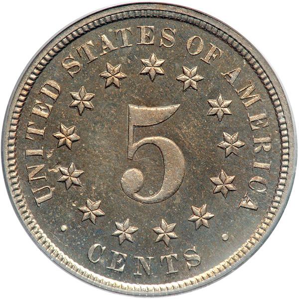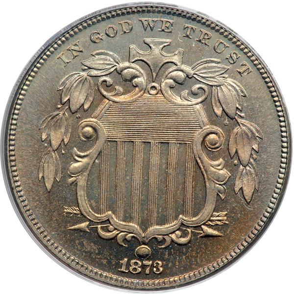 1873 Shield Nickel. Closed 3. PCGS graded Proof 64. Lovely golden toning. Desirable issue from the early series, only 1,100 Proofs made (PCGS # 3827) .