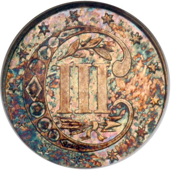 1873 Silver Three Cents. NGC graded Proof 64 PQ. CAC Approved. Housed in an Old Holder. Only 600 struck for this Proof only date, the final issue in this diminutive series which was made from 1851 to 1873. Attractively toned.