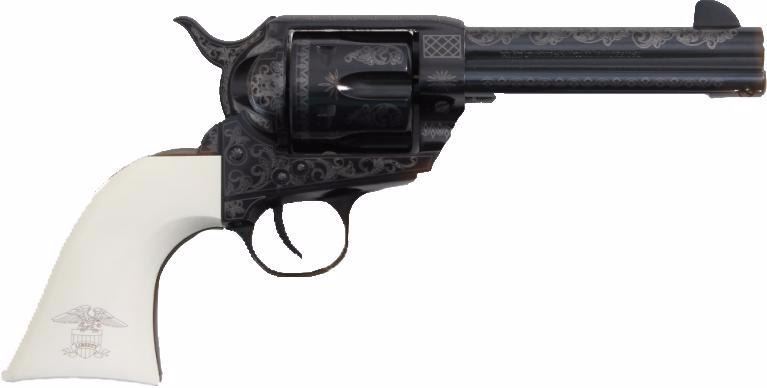 These 1873 revolvers are truly shooting works of art! Our transfer bar safety system provides the highest level of safety offered in an 1873 single action firearm. All models have steel frames and are authentic reproductions. The Liberty Model model is .44LC, has a White PVC grip, and has a 4.75" barrel with Blued finish. This model has a lasered engraved group which shows the Liberty name and an eagle symbol. The revolver's barrel, cylinder, and trigger area are also laser engraved with intricate designs. This is a 6-shot revolver.