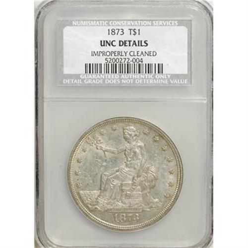<B>1873 T$1 --Improperly Cleaned--NGC. Unc Details.</B></I> NGC Census: (0/0). PCGS Population (0/0). Mintage: 396,600. (#7031)<BR><BR><B>Coin Engraver:</B> William Barber<BR><BR><b>Shipping:</b> Coins & Currency (<a target="_blank" href="http://www.heritageauctions.com/common/shipping.php">view shipping information</a>)