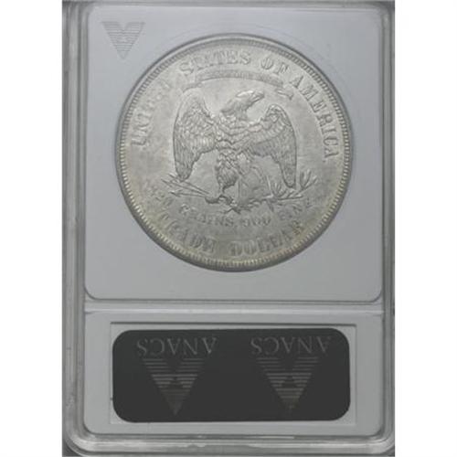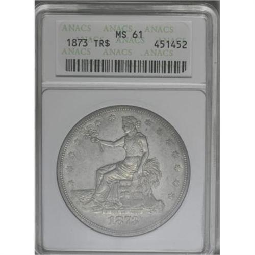<B>1873 T$1 MS61 ANACS.</B></I> This piece is softly struck, with flat details noted on Liberty's feet and head, as well as the obverse stars. The reverse is soft on the eagle's right (facing) leg and both talons, and slightly weak on UNITED. The surfaces display a coating of milky coloration on each side, and an absence of any noticeable marks or blemishes. A popular first-year issue in the Trade dollar series. <BR><BR><B>Coin Engraver:</B> William Barber<BR><BR><b>Shipping:</b> Coins & Currency (<a target="_blank" href="http://www.heritageauctions.com/common/shipping.php">view shipping information</a>)
