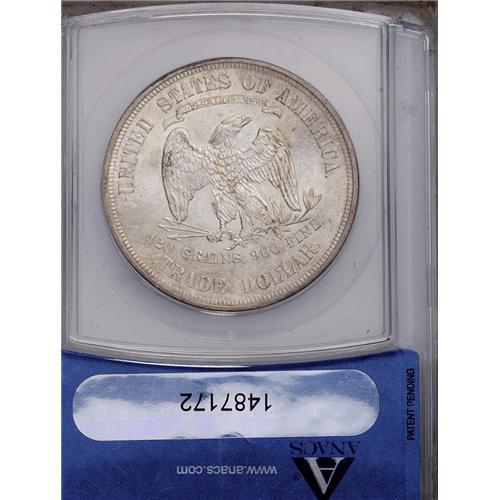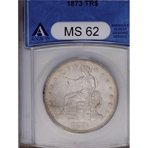 <B>1873<T$1> MS62 ANACS.</B></I> A dusky tan-gray inaugural year Trade dollar with subdued, smooth surfaces. Only the right (facing) claw and the top of Liberty's head lack a commanding strike. Although traditionally overshadowed by the 1873-CC, the 1873 is also scarce in Mint State, and is much more affordable.