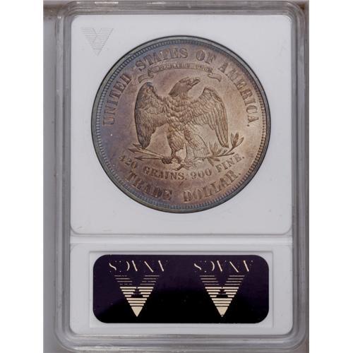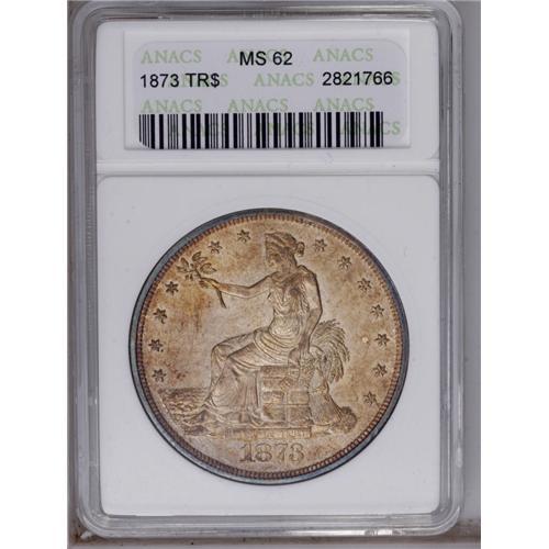 <B>1873<T$1> MS62 ANACS.</B></I> Handsomely toned surfaces which sparkle with original mint luster. Varying shades of reddish-gold are accented with subtle blue at the borders and lilac on the reverse. There are few contact marks. This is a nice example of the first year of issue for this short-lived series.