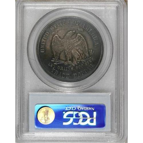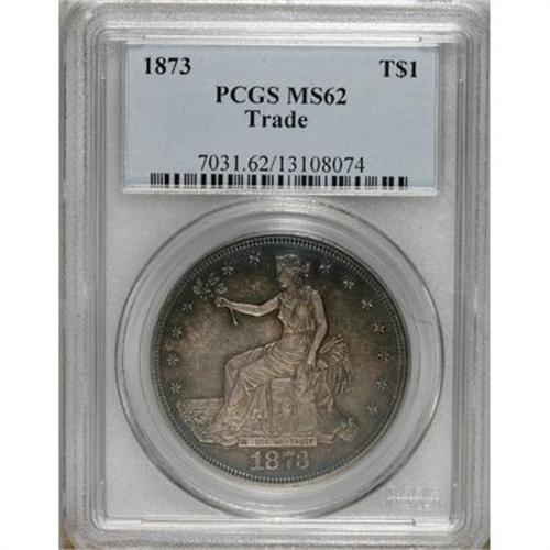 <B>1873 T$1 MS62 PCGS.</B></I> Dusky walnut-brown and sea-green embrace this lightly abraded example. All 1873-dated Trade dollars are scarce in Uncirculated grades, regardless of mint of origin. Population: 28 in 62, 59 finer (4/07).<BR><BR><b>Shipping:</b> Coins & Currency (<a target="_blank" href="http://www.heritageauctions.com/common/shipping.php">view shipping information</a>)