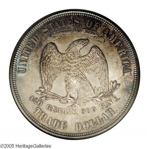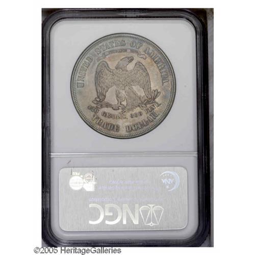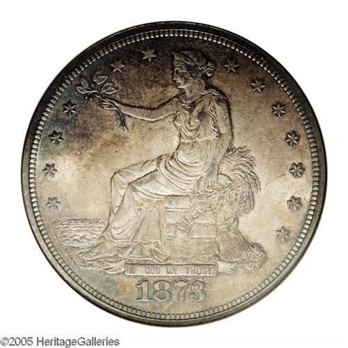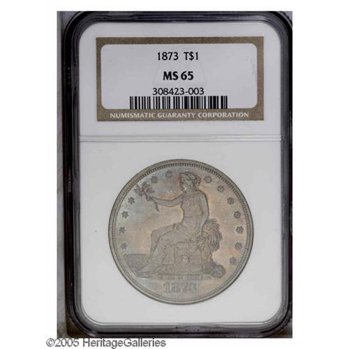 <B>1873<T$1> MS65 NGC.</B></I> Iridescent sea-green and orange-gold colors dominate each side of this lustrous Gem. The right (facing) eagle's leg and Liberty's upper hair are not completely impressed by the dies, as usual for the type. A lightly marked example of this first year issue, which has a mintage beneath 400,000 pieces. The 1873 is scarce in any Mint State grade, and is an important find as a Gem. Census: 7 in 65, 3 finer (10/05).<BR><I>From The Albert E. Willis Collection.</B></I>