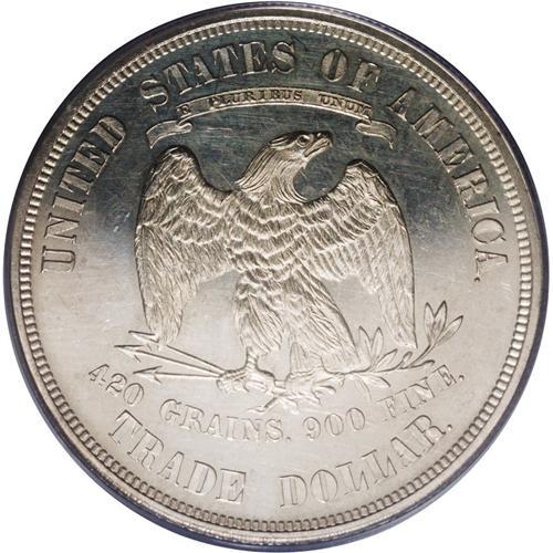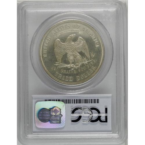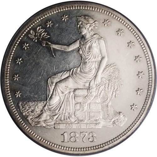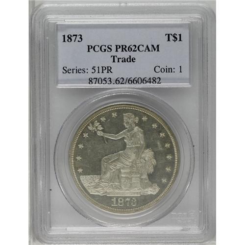 <B>1873<T$1> PR62 Cameo PCGS.</B></I> First year of issue for the beautifully designed Trade dollar. Each side is essentially brilliant with nicely reflective fields that show minimal hairlines and abrasions for the grade. The devices are frosted and provide a pronounced cameo contrast.