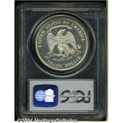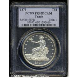 <B>1873<T$1> PR62 Deep Cameo PCGS.</B></I> First year of issue for the enigmatic and beautifully designed Trade Dollar. Each side is mostly brilliant with the exception of a very light accent of pastel-golden patina that surrounds the peripheries. The devices are nicely frosted and provide a pronounced cameo contrast between the fields and devices. Numerous hairlines in the vulnerable fields limit the grade. To date, this is the only Deep Cameo Proof 1873 Trade Dollar we have offered. Population: 1 in 62 Deep Cameo, 1 finer (7/04). <BR><BR><B>Important notice:</B> Heritage usually auctions material at the rate of 200-250 lots per hour. On some occasions eBay Live bid software or the Internet may not be able to keep up with the pace of the auction. We recommend placing a realistic absentee bid now as insurance to avoid disappointment. Occasionally the auctioneer may eliminate or reject an eBay Live bid, and the auctioneer may also reopen a lot after the close of the eBay live bidding (usually because we missed an audience bid), and may reject your bid even if it shows you as the winning bidder. By bidding via eBay Live, you agree that Heritage may award the lot to another bidder at its sole discretion under the circumstances described above or any other reasonable circumstances. Since eBay bids are not shown to us until we open the lot on the floor, we treat those bids just like floor bids. In most cases the floor responds before the eBay bid is presented to us, due to Internet lag time, so for consistency we have made it a policy that floor bids are always considered first over tie eBay live bids. Also please note that all Heritage lots purchased through eBay Live carry a 20% Buyer's Premium. Please make sure you read the Terms and Conditions before you bid. </span></font></tr></table></td></tr></table>