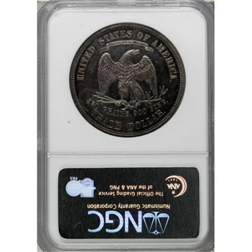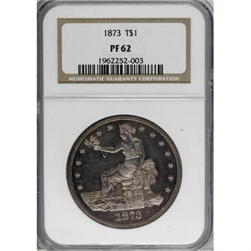 <B>1873 T$1 PR62 NGC.</B></I> One of 865 proofs struck for the initial year of production, this richly toned, boldly impressed piece has ample bronze and claret patina with splashes of blue at the margins. The surfaces show minimal contact, though a number of fine hairlines are present in the fields.<BR><BR><B>Coin Engraver:</B> William Barber<BR><BR><b>Shipping:</b> Coins & Currency (<a target="_blank" href="http://www.heritageauctions.com/common/shipping.php">view shipping information</a>\)