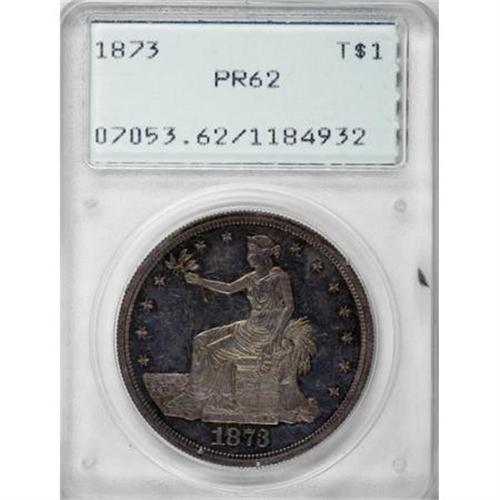 <B>1873 T$1 PR62 PCGS.</B></I> An exacting strike sharpens the design features, and whispers of orange and violet enliven both sides of this lovely Trade dollar proof. A few minor handling marks limit the grade. Housed in a first generation holder.<BR><BR><B>Coin Engraver:</B> William Barber<BR><BR><b>Shipping:</b> Coins & Currency (<a target="_blank" href="http://www.heritageauctions.com/common/shipping.php">view shipping information</a>)
