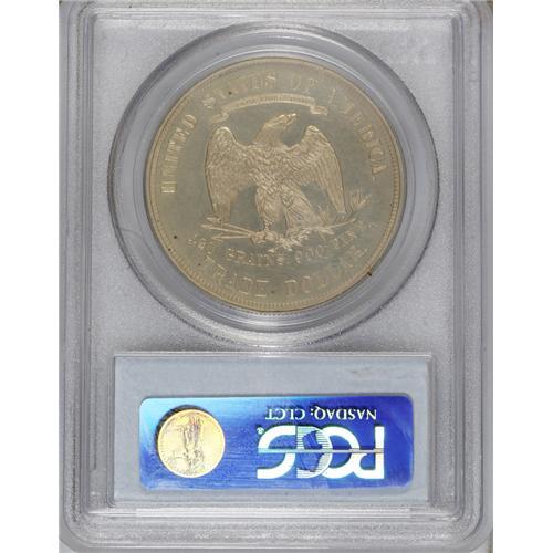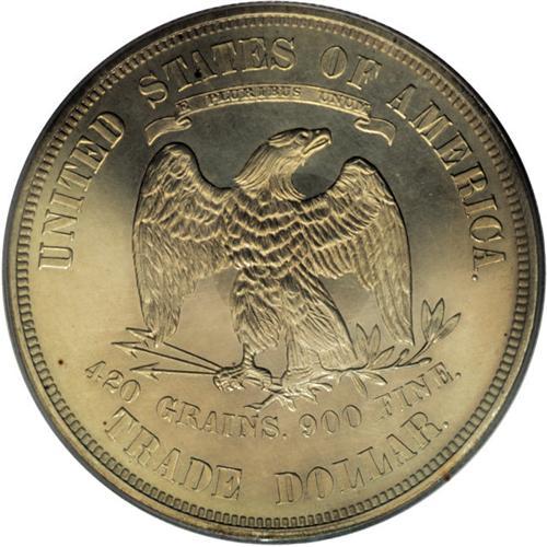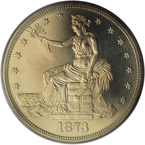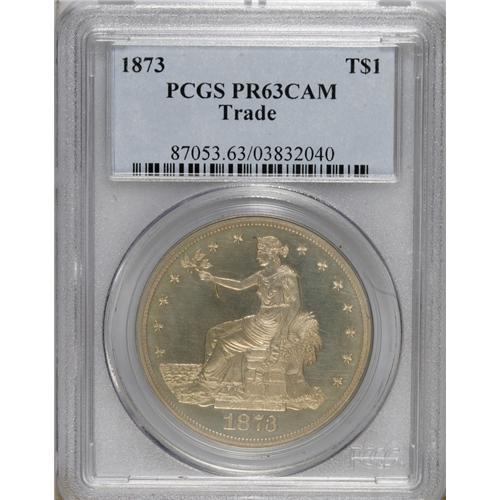 <B>1873 T$1 PR63 Cameo PCGS.</B></I> This proof Trade dollar issue, the first of 13 struck from 1873 to 1885, amounted to just 865 specimens. Both sides of this gleaming Select representative exhibit strong contrast despite hazy cream-gray patina that covers the peripheral areas and much of the devices. A number of light hairlines in the obverse fields limit the grade. Population: 11 in 63 Cameo, 5 finer (3/07).<BR><BR><b>Shipping:</b> Coins & Currency (<a target="_blank" href="http://www.heritageauctions.com/common/shipping.php">view shipping information</a>)