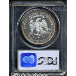 <B>1873<T$1> PR63 Cameo PCGS.</B></I> Generally untoned, with a thin veil of haziness over glassy surfaces and a touch of golden-russet at the outermost rims. Very few proofs from this initial year of Trade Dollar production have received a Cameo designation. Population: 7 in 63 Cameo, 3 finer (4/04). <BR><BR><B>Important notice:</B> Heritage usually auctions material at the rate of 200-250 lots per hour. On some occasions eBay Live bid software or the Internet may not be able to keep up with the pace of the auction. We recommend placing a realistic absentee bid now as insurance to avoid disappointment. Occasionally the auctioneer may eliminate or reject an eBay Live bid, and the auctioneer may also reopen a lot after the close of the eBay live bidding (usually because we missed an audience bid), and may reject your bid even if it shows you as the winning bidder. By bidding via eBay Live, you agree that Heritage may award the lot to another bidder at its sole discretion under the circumstances described above or any other reasonable circumstances. Since eBay bids are not shown to us until we open the lot on the floor, we treat those bids just like floor bids. In most cases the floor responds before the eBay bid is presented to us, due to Internet lag time, so for consistency we have made it a policy that floor bids are always considered first over tie eBay live bids. Also please note that all Heritage lots purchased through eBay Live carry a 20% Buyer's Premium. Please make sure you read the Terms and Conditions before you bid.