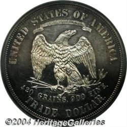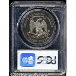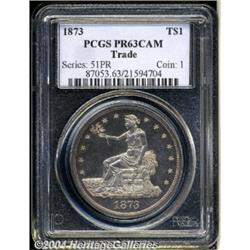 <B>1873<T$1> PR63 Cameo PCGS.</B></I> The borders offer navy-blue hues, while the centers are filled with consistent pale mauve color. A meticulously struck specimen with attractive surfaces. A bright die polish line on the lower right reverse is of mint origin. Proofs of this first year issue are noted for a prominent raised die line that appears to penetrate Liberty's ankle. Only 865 proofs were struck. Population: 6 in 63 Cameo, 3 finer (3/04). <BR><BR><B>Important notice:</B> Heritage usually auctions material at the rate of 200-250 lots per hour. On some occasions eBay Live bid software or the Internet may not be able to keep up with the pace of the auction. We recommend placing a realistic absentee bid now as insurance to avoid disappointment. Occasionally the auctioneer may eliminate or reject an eBay Live bid, and the auctioneer may also reopen a lot after the close of the eBay live bidding (usually because we missed an audience bid), and may reject your bid even if it shows you as the winning bidder. By bidding via eBay Live, you agree that Heritage may award the lot to another bidder at its sole discretion under the circumstances described above or any other reasonable circumstances. Since eBay bids are not shown to us until we open the lot on the floor, we treat those bids just like floor bids. In most cases the floor responds before the eBay bid is presented to us, due to Internet lag time, so for consistency we have made it a policy that floor bids are always considered first over tie eBay live bids. Also please note that all Heritage lots purchased through eBay Live carry a 20% Buyer's Premium. Please make sure you read the Terms and Conditions before you bid. </span></font></tr></table></td></tr></table>
