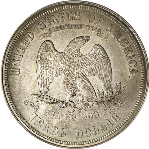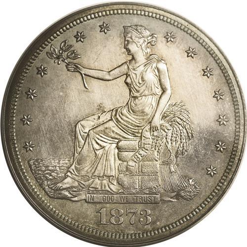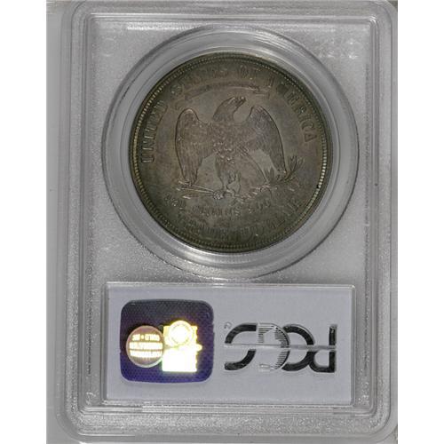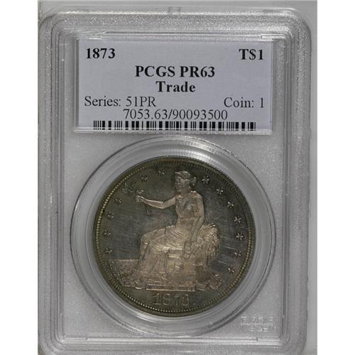 <B>1873<T$1> PR63 PCGS.</B></I> Deep lilac-gray and heather toning increases in intensity toward the rims, with a dash of mint-green added on the reverse. The luster is a bit subdued, and the light traces of an old fingerprint mark are in the upper right obverse field, blending in with the toning. This is a nonetheless nice and affordable proof example that is well struck. A light, long scrape on the reverse runs downward from the lowest arrow tip through the last 0 in 900 and the R in DOLLAR. Population: 43 in 63, 35 finer (7/06).