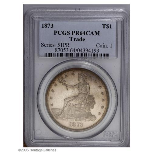 <B>1873<T$1> PR64 Cameo PCGS.</B></I> Proofs as well as business strikes are difficult to come by with the 1873 date. Only 865 proofs were produced, and while this is actually a substantial number for the time, attrition apparently took a heavy toll on this date as there are surprisingly few examples extant today in high grades. This is a nicely reflective example that has deep golden patina that turns somewhat deeper around the margins. A few wispy hairlines can be seen beneath the toning with a magnifier, and there is just a slight bit of softness over the highpoints of the design. Population: 5 in 64, 1 finer (10/05).