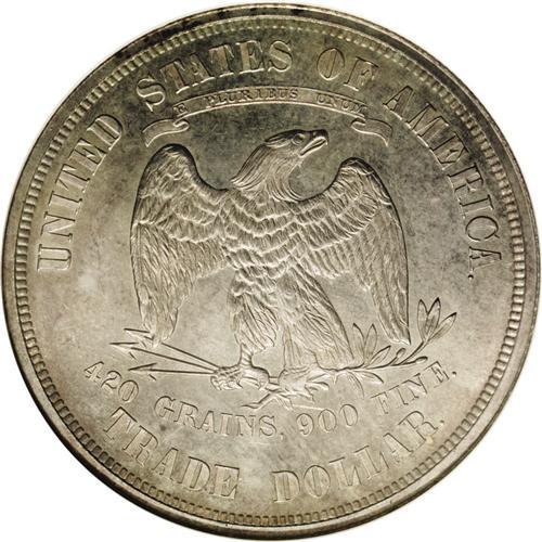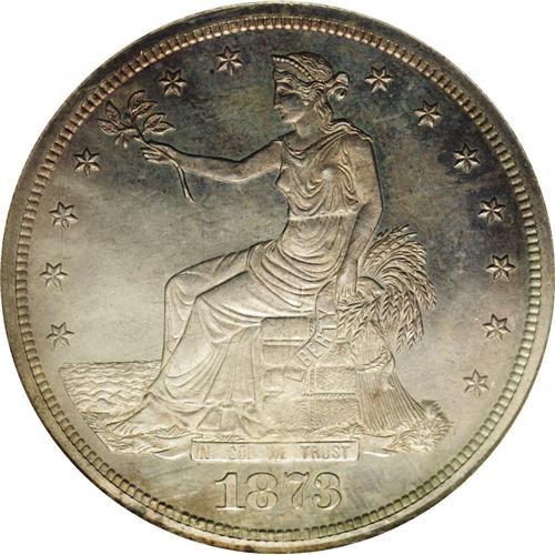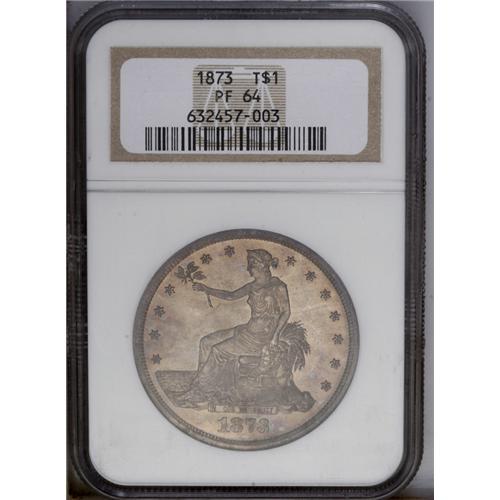 <B>1873<T$1> PR64 NGC.</B></I> A Choice example of this first-year issue that shows contrast between the reflective fields and frosted devices. Dusky-gold to gray over the entire coin and evenly toned. The surfaces are clean for the grade, as few hairlines are present and no significant contact marks are seen. One short curved lint mark is found on top of the A in DOLLAR.<BR><I>From The Larj Collection.</B></I>