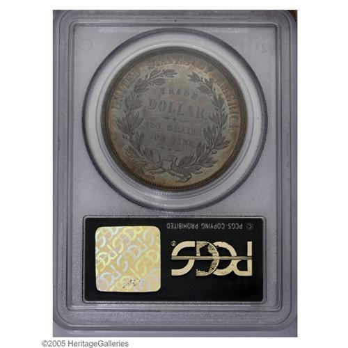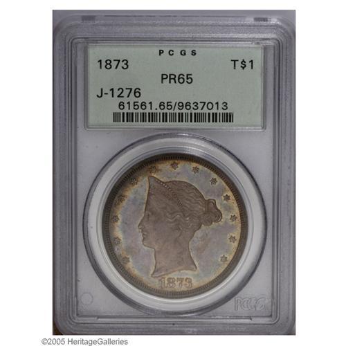 <B>1873<T$1> Trade Dollar, Judd-1276, Pollock-1418, R.5, PR65 PCGS.</B></I> A distinctive Trade dollar pattern with a small head of Liberty facing left set amid a large, open field with 13 stars at the margin. The reverse has the required legends mostly set in the middle of that side, surrounded by an olive wreath, and UNITED STATES OF AMERICA at the upper periphery. Struck in silver with a reeded edge. Beautifully toned, this Gem exhibits multiple layers of purple, olive, and gray toning on each side with multicolored rings around the margins. A spectacular Trade dollar pattern.