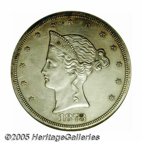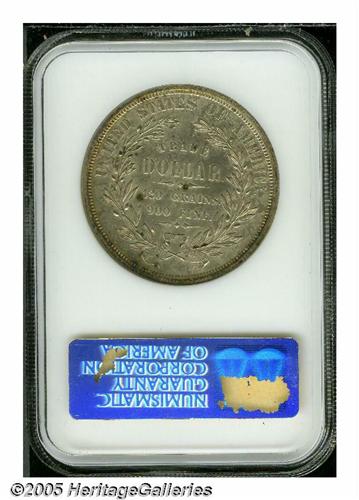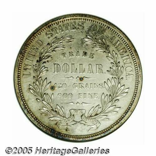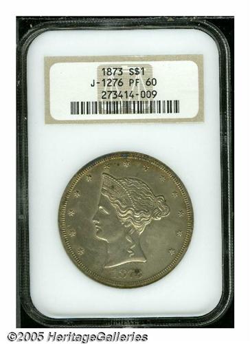 <B>1873<T$1> Trade Dollar, Judd-1276, Pollock-1418, R.5, PR60 NGC.</B></I> A distinctive Trade dollar pattern with a small head of Liberty facing left set amid a large, open field with 13 stars at the margin. The reverse has the required legends mostly set in the middle of that side, surrounded by an olive wreath, and UNITED STATES OF AMERICA at the upper periphery. Struck in silver with a reeded edge. The surfaces have a brilliant pewter-gray appearance with reflective mirrored finish on both sides. Several small spots of blue and iridescent color appear on both sides.