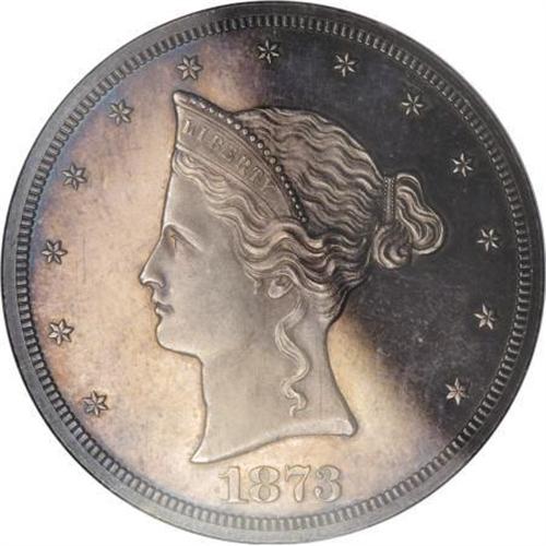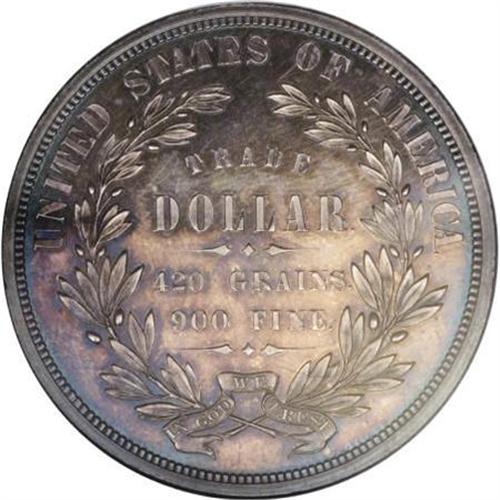 <B>1873 T$1 Trade Dollar, Judd-1276, Pollock-1418, R.5, PR65 NGC.</B></I> A distinctive Trade dollar pattern with a small head of Liberty facing left set amid a large, open field with 13 stars at the margin. The reverse has the required legends mostly set in the middle of that side, surrounded by an olive wreath, and UNITED STATES OF AMERICA at the upper periphery. Struck in silver with a reeded edge. Nicely reflective, the surfaces are gray-lilac over each side with deeper peripheral color.<BR><BR><b>Shipping:</b> Coins & Currency (<a target="_blank" href="http://www.heritageauctions.com/common/shipping.php">view shipping information</a>)