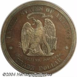 <B>1873<T$1> Trade Dollar, Judd-1295, Pollock-1437, R.7, PR65 Red and Brown PCGS.</B></I> This trade dollar pattern has a seated Liberty facing left and sitting on a globe, with bales of cotton at her feet. The reverse has a small eagle with a shield and scroll at lower right. Struck in copper with a reeded edge. This is one of six 1873 trade dollar patterns that were sold at the time of issue as six-piece sets for $30. A splendid Gem with deeply mirrored fields and lustrous devices. Rich mahogany and olive surfaces with iridescent toning. This is a lovely pattern with exceptional aesthetic appeal. <BR><BR><B>Important notice:</B> Heritage usually auctions material at the rate of 200-250 lots per hour. On some occasions eBay Live bid software or the Internet may not be able to keep up with the pace of the auction. We recommend placing a realistic absentee bid now as insurance to avoid disappointment. Occasionally the auctioneer may eliminate or reject an eBay Live bid, and the auctioneer may also reopen a lot after the close of the eBay live bidding (usually because we missed an audience bid), and may reject your bid even if it shows you as the winning bidder. By bidding via eBay Live, you agree that Heritage may award the lot to another bidder at its sole discretion under the circumstances described above or any other reasonable circumstances. Since eBay bids are not shown to us until we open the lot on the floor, we treat those bids just like floor bids. In most cases the floor responds before the eBay bid is presented to us, due to Internet lag time, so for consistency we have made it a policy that floor bids are always considered first over tie eBay live bids. Also please note that all Heritage lots purchased through eBay Live carry a 20% Buyer's Premium. Please make sure you read the Terms and Conditions before you bid. </span></font></tr></table></td></tr></table>