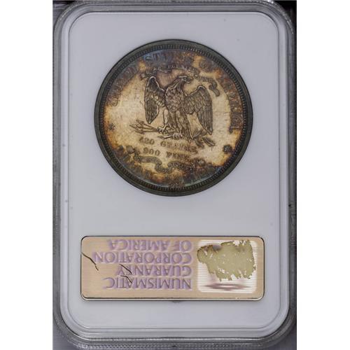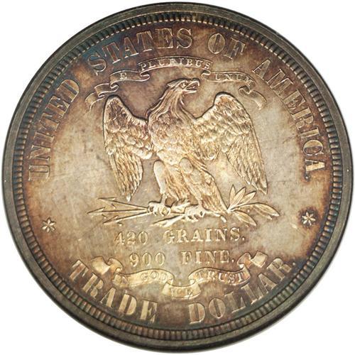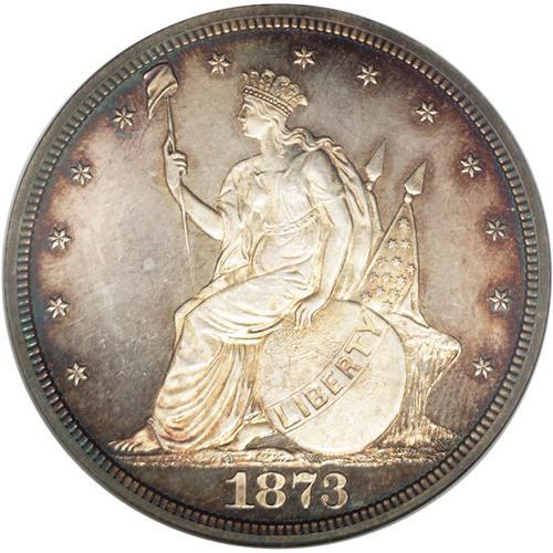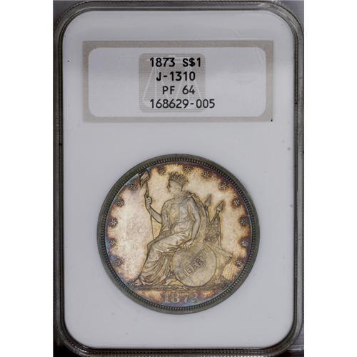 <B>1873<T$1> Trade Dollar, Judd-1310, Pollock-1453, R.4, PR64 NGC.</B></I> A Trade dollar design struck in the year of its regular issue debut that shows Liberty seated on the obverse wearing an Indian headdress, Liberty pole and cap in her right hand, left hand resting on a globe, and conjoined flags behind. The reverse has a small eagle in the upper half with the weight and fineness below and the statutory legends on scrolls both above and below. Struck in silver with a reeded edge. One of the designs that was sold by the Mint in six-piece sets for $30. Well struck aside from the eagle's claws, and the moderately toned surfaces are only lightly hairlined.