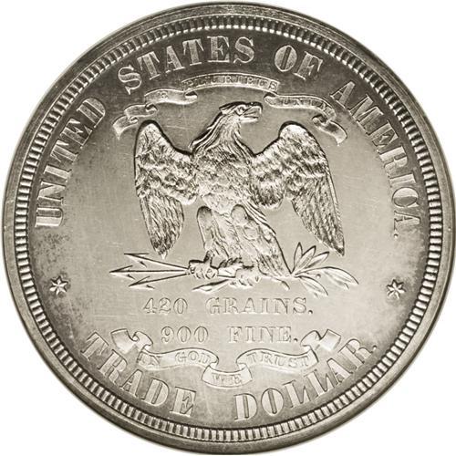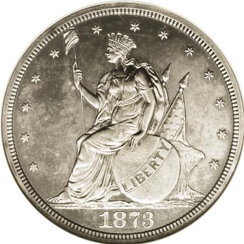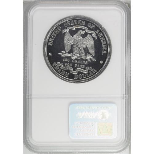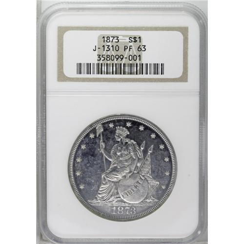 <B>1873<T$1> Trade Dollar, Judd-1310, Pollock-1453, R.4, PR63 NGC.</B></I> William Barber's Indian Princess obverse for the Trade dollar. Liberty is seated left and holds a pole and cap in her right hand. Her left hand rests on a globe. Conjoined flags emerge behind Liberty. The reverse features a small eagle with its head turned right. The reverse legends are similar to the regular Trade dollar, except that IN GOD WE TRUST occupies an exergue banner. Struck in silver with a reeded edge. This untoned specimen is subdued but has no visible hairlines. The strike is attentive despite slight weakness on the eagle's claws. Census: 6 in 63, 9 finer (9/06).