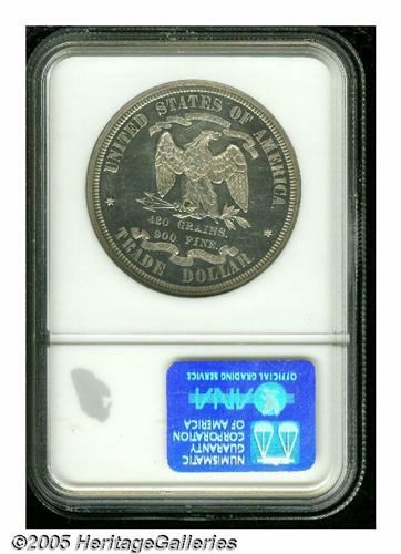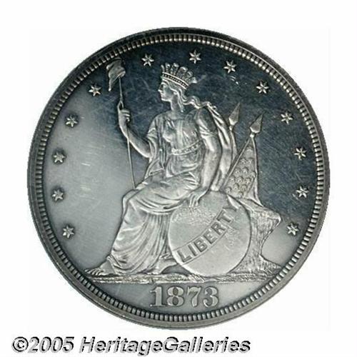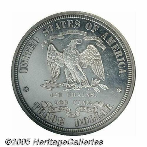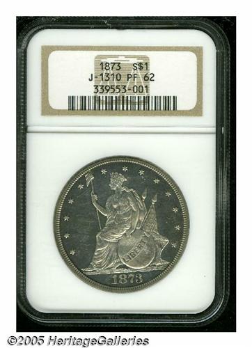 <B>1873<T$1> Trade Dollar, Judd-1310, Pollock-1453, R.4, PR62 NGC.</B></I> A Trade Dollar design struck in the year of its regular issue debut that shows Liberty seated on the obverse wearing an Indian headdress, Liberty pole and cap in her right hand, left hand resting on a globe, and conjoined flags behind. The reverse has a small eagle in the upper half with the weight and fineness below and the statutory legends on scrolls both above and below. Struck in silver with a reeded edge. This is one of the designs that was sold by the Mint in six-piece sets for $30. The sets were made in silver with both plain and reeded edges, copper, and aluminum. This is a mostly brilliant example that shows a bit of light toning around the margins. Moderately hairlined.