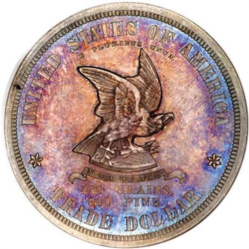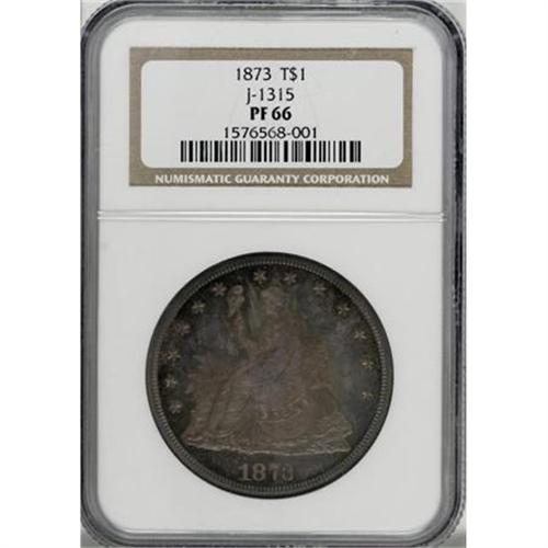 <B>1873 T$1 Trade Dollar, Judd-1315, Pollock-1458, R.4, PR66 NGC.</B></I> This is Bailly's design for the Seated Liberty coinage with Liberty seated by a globe, surrounded by cotton, tobacco, and wheat. Her left hand rests on the globe and right hand supports a pole and cap. A banner across the globe is inscribed LIBERTY, with 13 stars around the border and the date below. The reverse has a small defiant eagle facing right, holding an olive branch and three arrows with the inscription UNITED STATES OF AMERICA around, the denomination TRADE DOLLAR below, and 420 GRAINS, 900 FINE in the lower field. A ribbon below the eagle bears the motto IN GOD WE TRUST. Struck in silver with a reeded edge. Lovely medium gray proof surfaces are accented by pale gold color and peripheral blue toning. Slight design weakness appears at the centers, especially evident on the reverse. This is a splendid Gem that will interest a number of pattern collectors.<BR><BR><b>Shipping:</b> Coins & Currency (<a target="_blank" href="http://www.heritageauctions.com/common/shipping.php">view shipping information</a>)