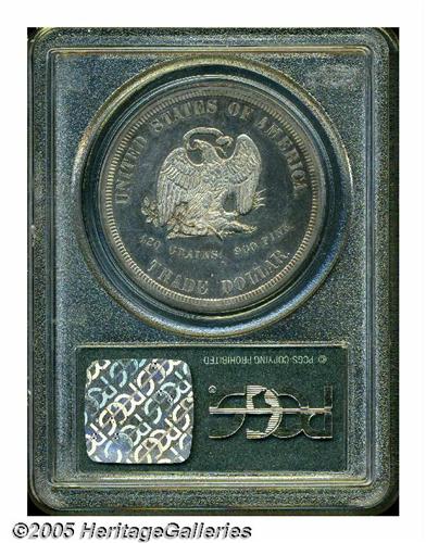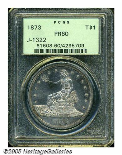<B>1873<T$1> Trade Dollar, Judd-1322, Pollock-1465, R.4, PR60 PCGS.</B></I> The obverse is similar to the adopted design, but with a longer base. The reverse shows a small eagle with spread wings and billowing scroll in its beak. Struck in silver with a reeded edge. Examples of this pattern were included in the six-piece sets distributed by the Mint in silver, copper, and aluminum and with plain and reeded edges. Obviously hairlined, the bright surfaces are lightly toned in golden-brown shadings.