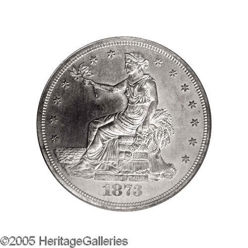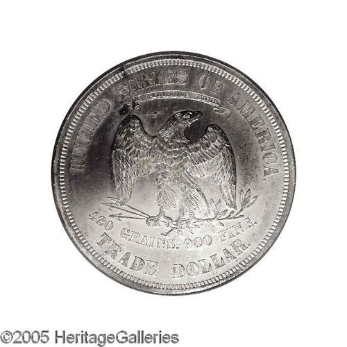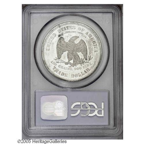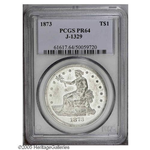 <B>1873<T$1> Trade Dollar, Judd-1329, Pollock-1474, High R.7, PR64 PCGS.</B></I> From regular issue dies, but struck in white metal with a reeded edge. An extremely rare pattern, PCGS has certified only two pieces, this and a PR60. NGC has not encapsulated an example of the Judd variety. Judd-1329 is confirmed as a dies trial, rather than a delicacy created for collectors. uspatterns.com quotes from a July 11, 1873 letter that Mint Superintendent James Pollock wrote to Mint Director Henry Linderman: "I send you specimen of trade dollar in tin struck today. We will commence the regular coinage of trade $ in a few hours. The enclosed will give you a tolerably correct idea of the silver dollar." This pinpoint-sharp specimen has attractive field reflectivity, and although both sides exhibit die rust and die striations (as made), post-strike contact is nearly absent. A wonderful addition to an advanced Trade Dollar collection. An opportunity to acquire this extremely rare pattern, particularly in desirable condition, may not arise again for many years.